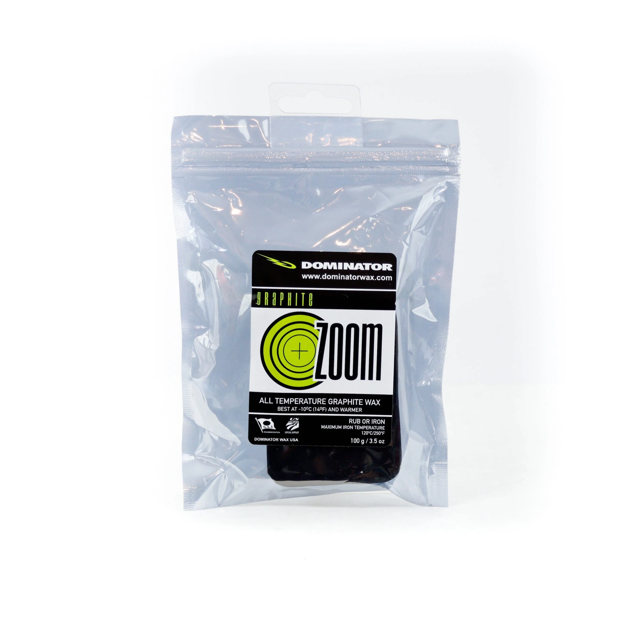 The Dominator ZOOM Wax you know and love, now with the addition of graphite to enhance the performance on warmer, dirtier snow. Graphite is blended in as an anti-static and gives increased lubrication in abrasive snow conditions.